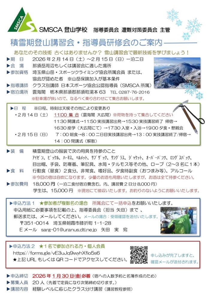 2/14-15 積雪期登山講習会・指導員研修会 開催のお知らせ